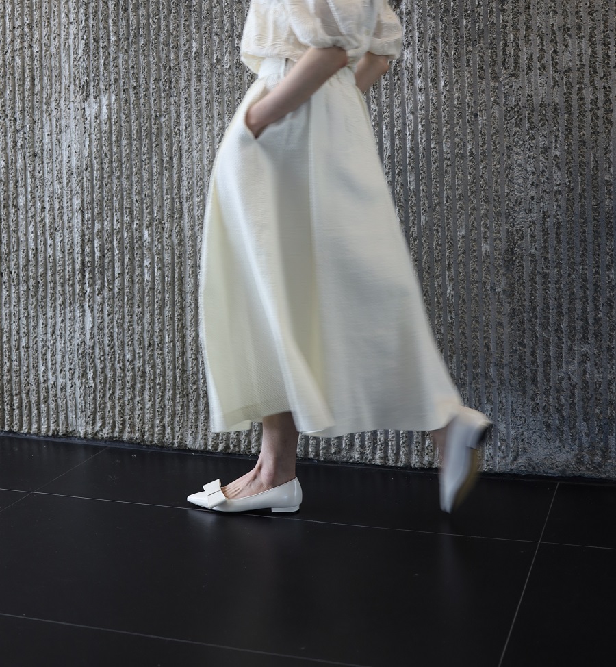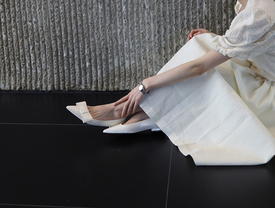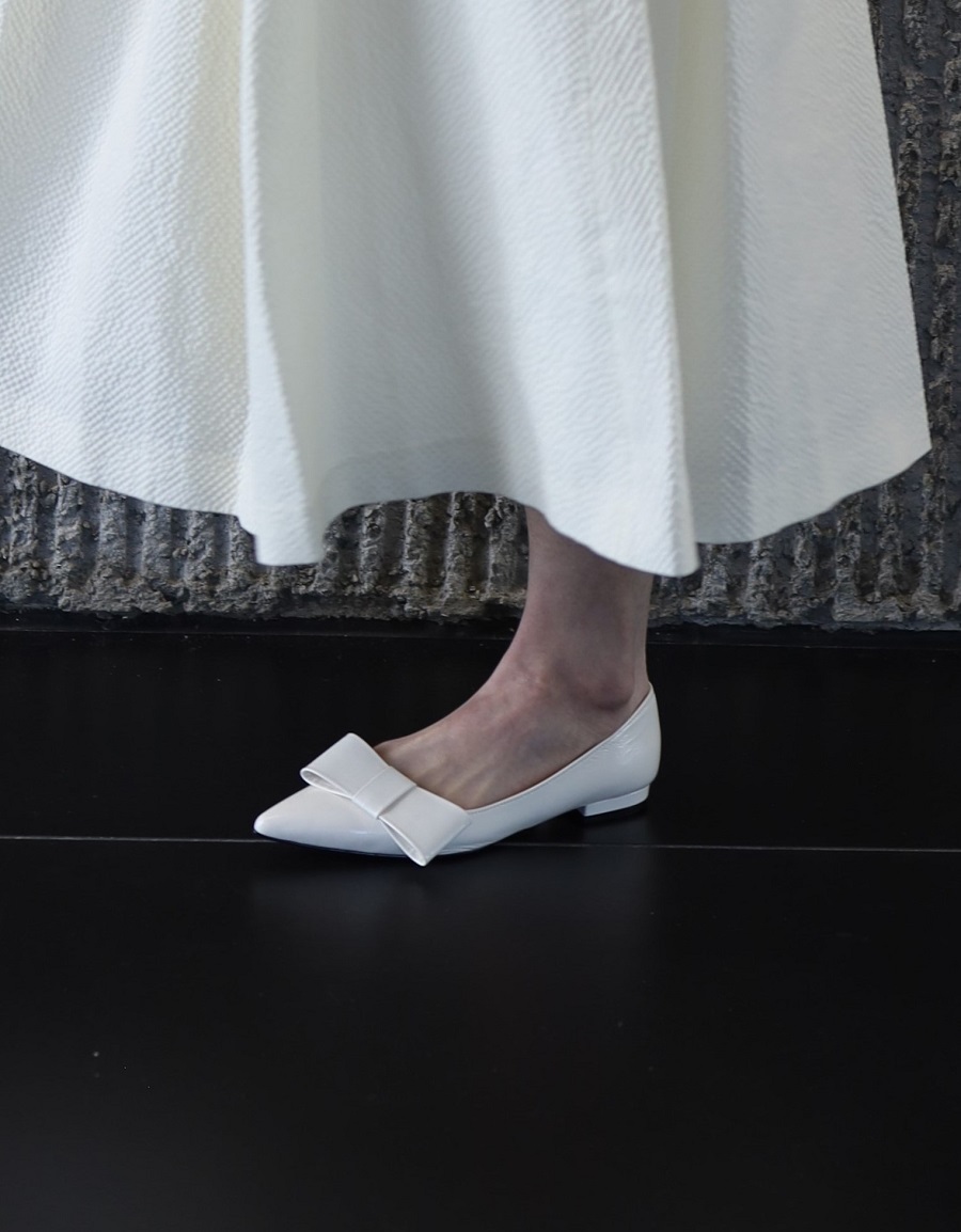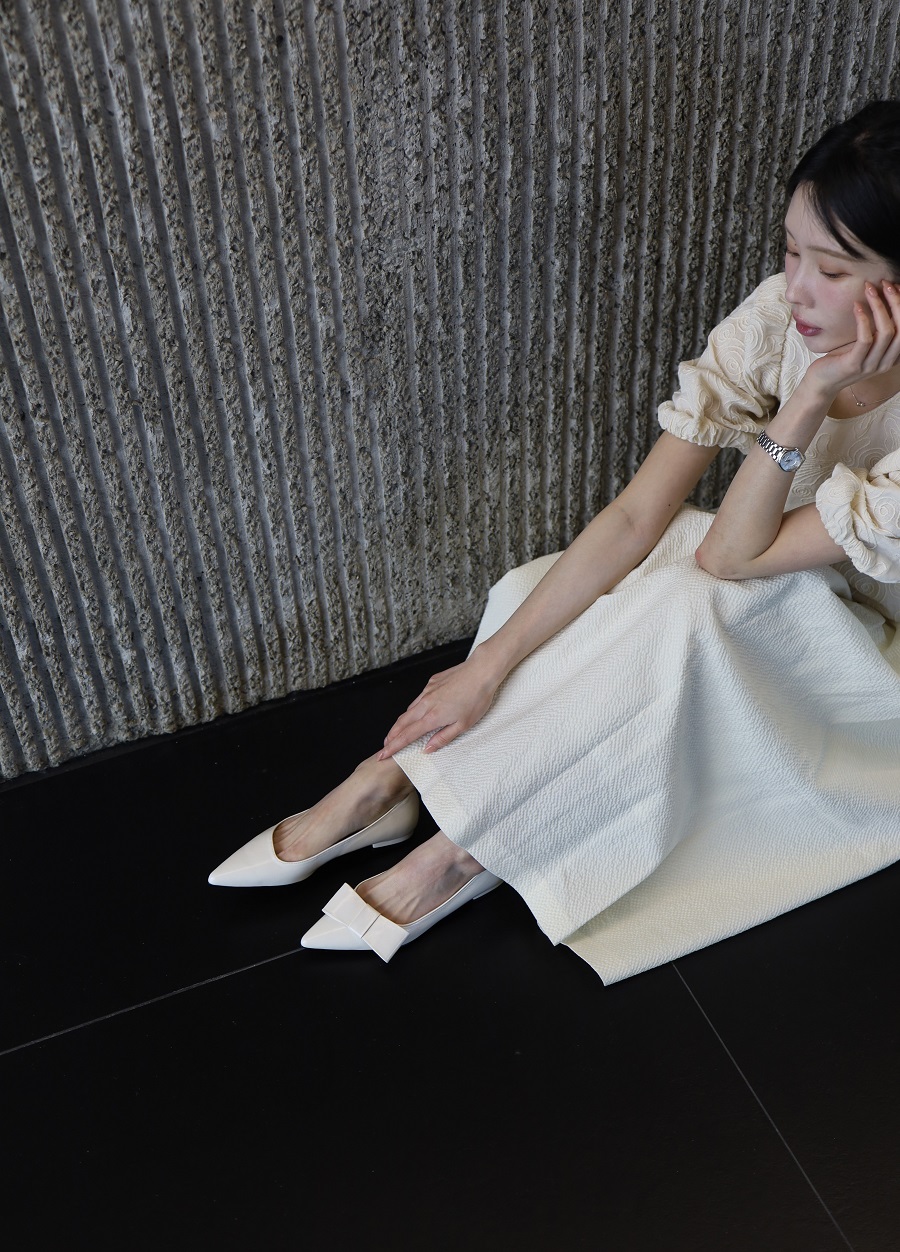 - 심플한 기본형의 라인에서 아구라인만 비대칭 사선으로 디자인해 포인트를 주었으며, 한쪽만 큰 리본을 더하여 포인트를 주었습니다.