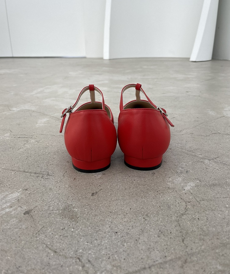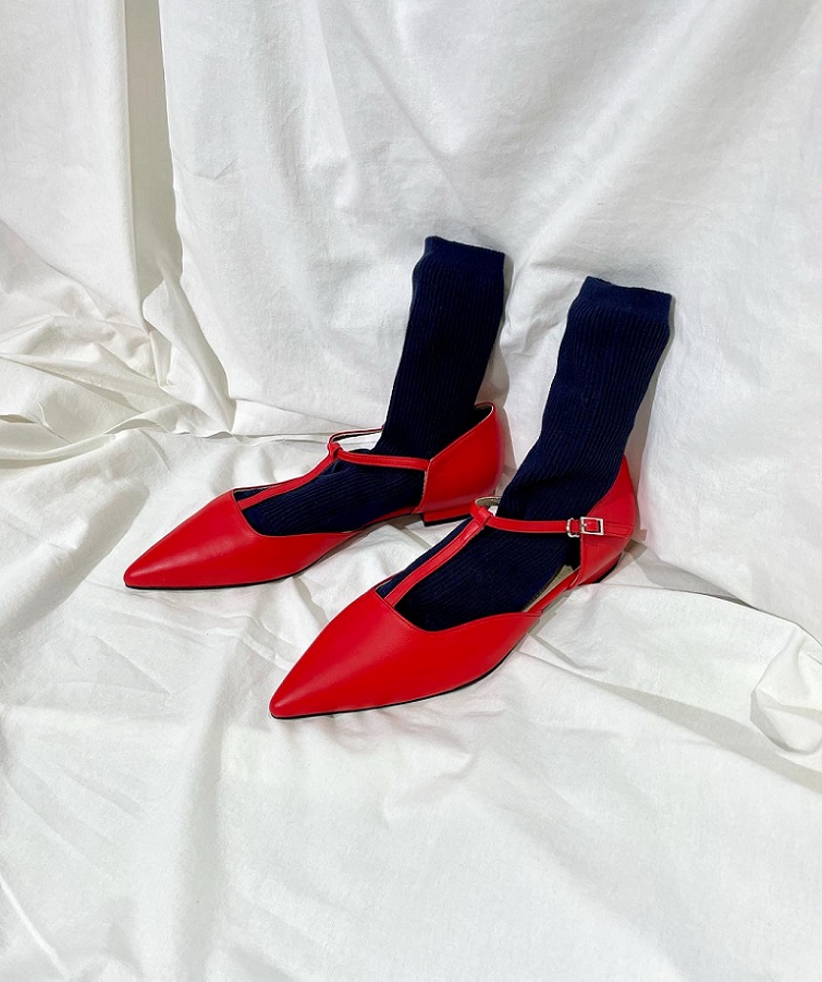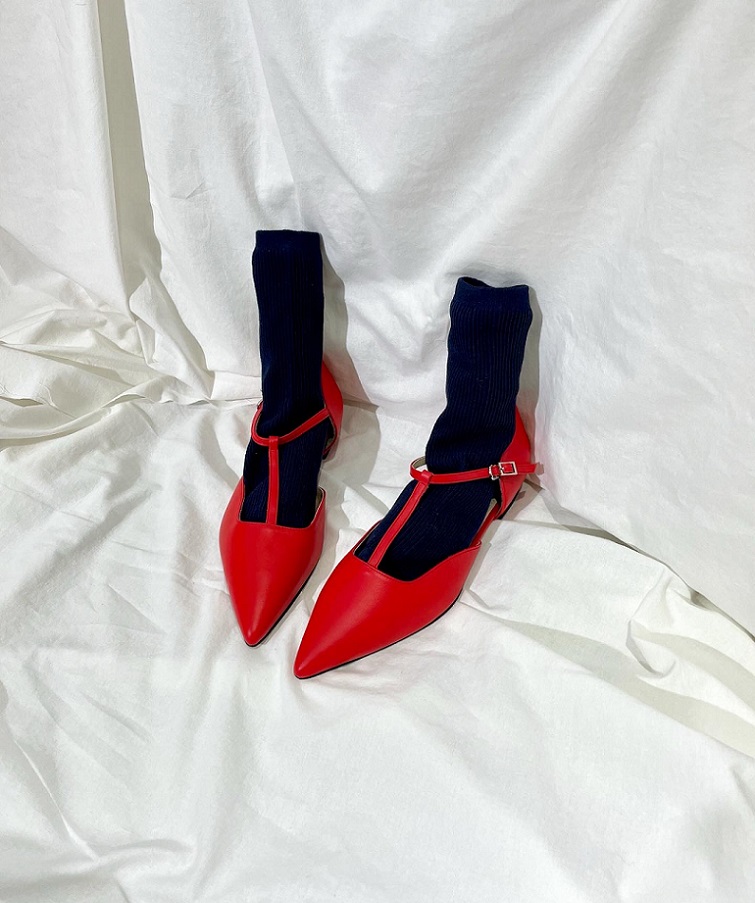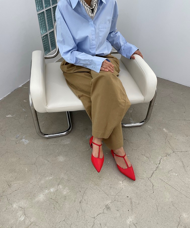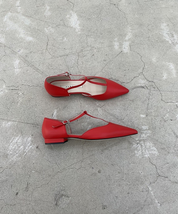 -T-strap 의 기장을 일반적인 기준보다 짧게 위치하도록 디자인하여 발목의 가장 가는 부분 아래쪽에 시선이 집중되므로 발목이 더욱 가늘어 보이고 종아리가 더 길어보이는 효과가 있습니다.