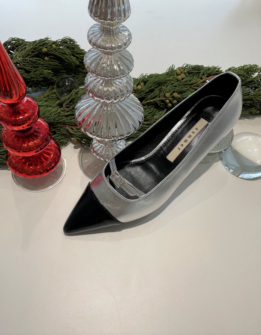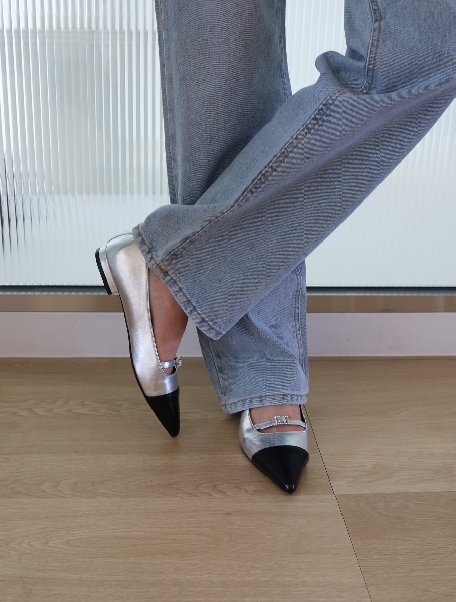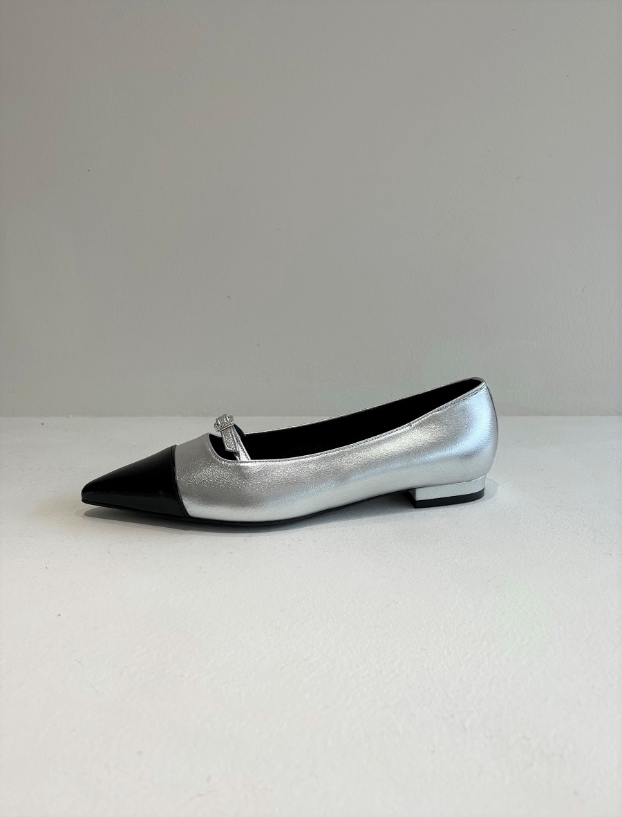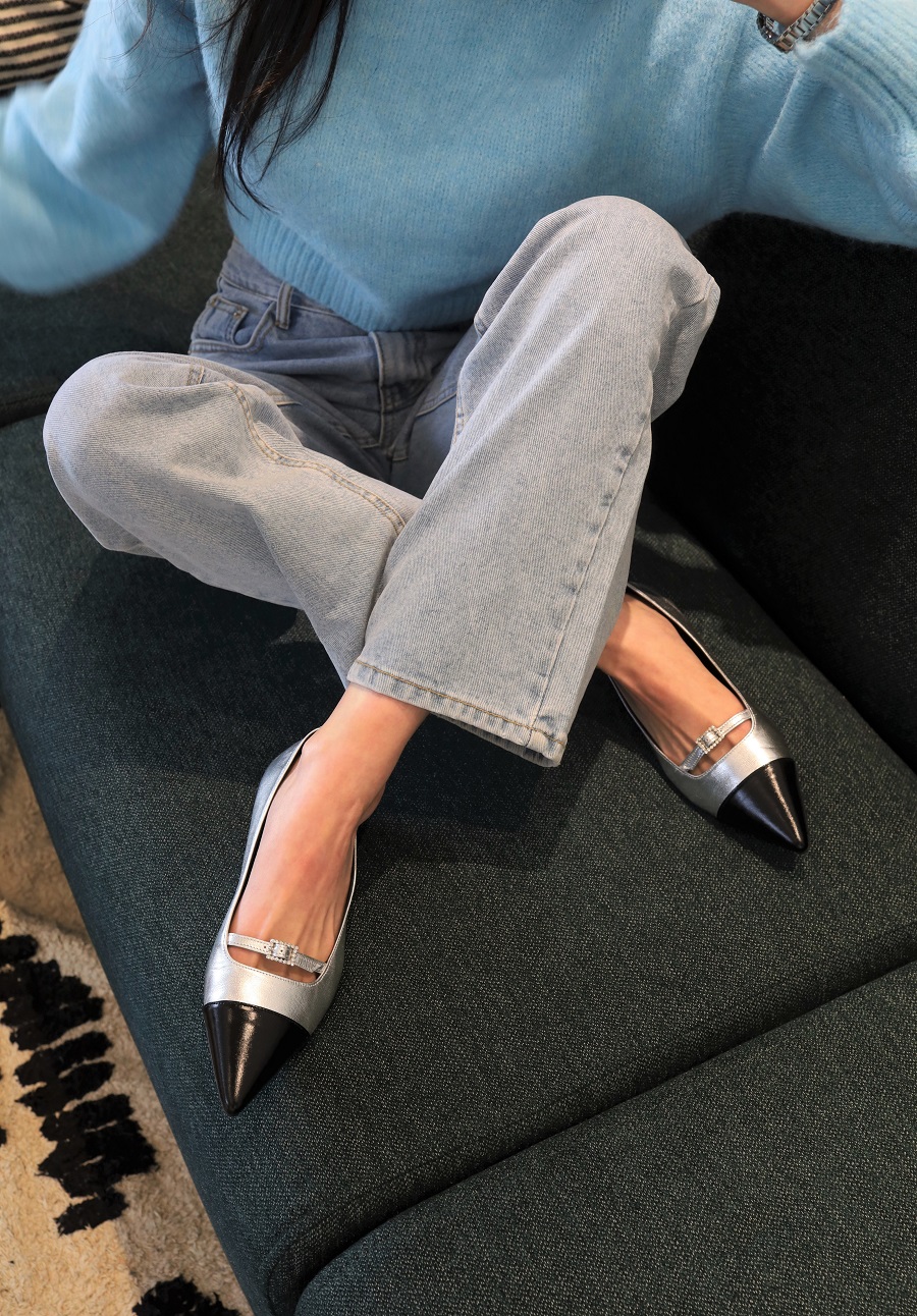 - 실버 컬러의 부드러운 양가죽 소재와 블랙 컬러의 유광 소가죽을 콤비하여 디자인한 특별한 느낌의 플랫 슈즈 입니다.