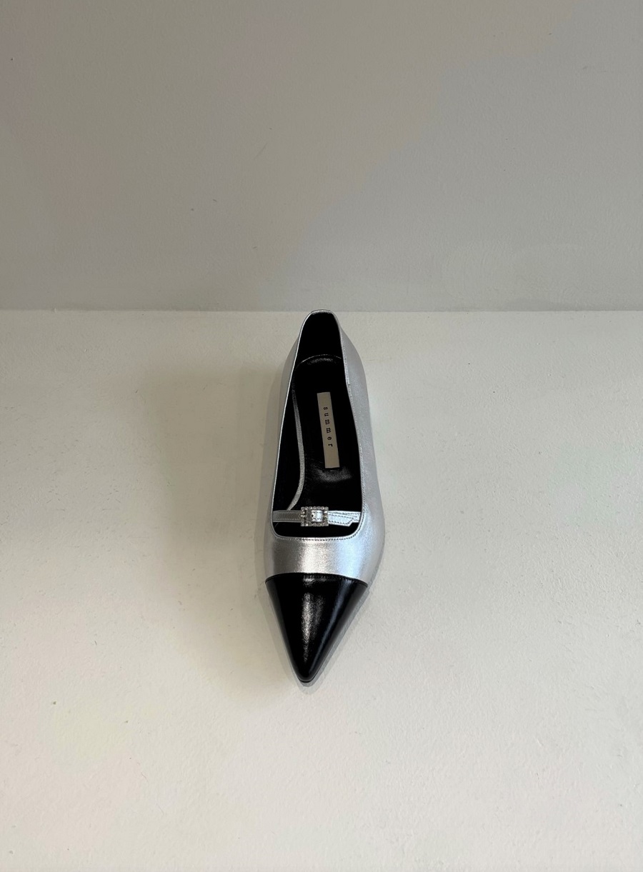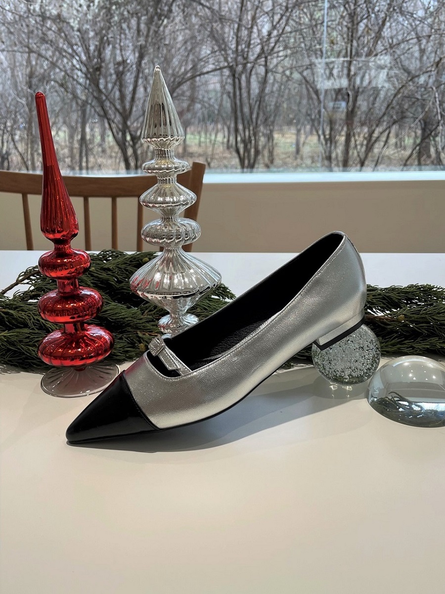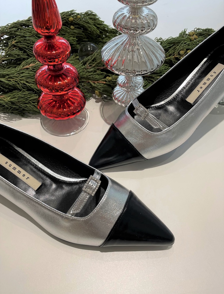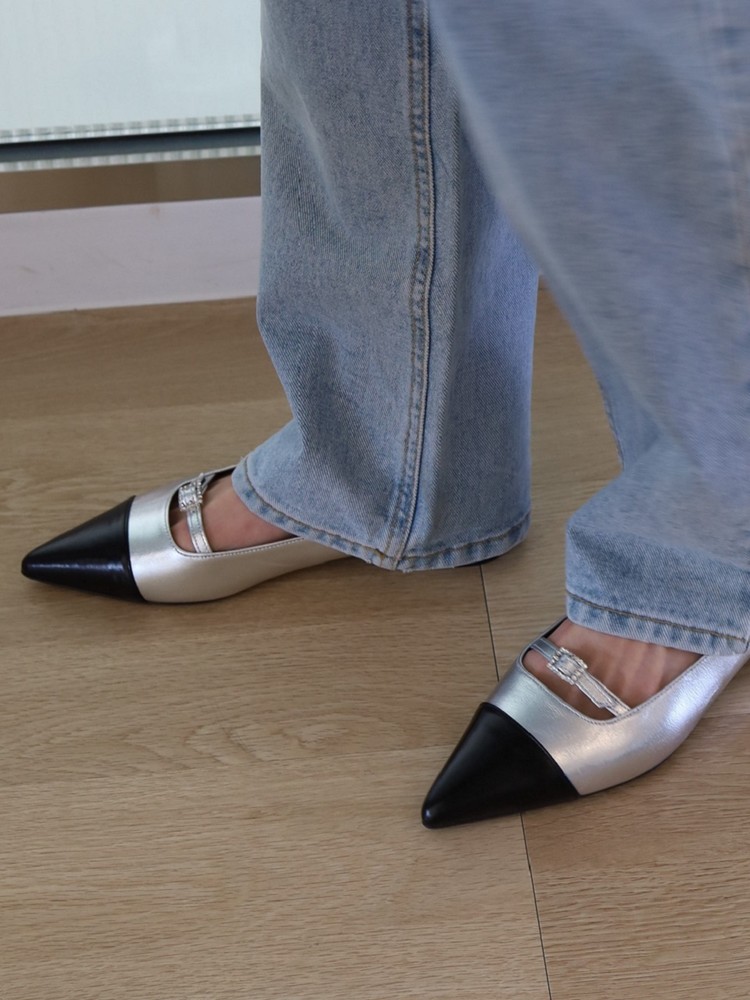 - 실버 컬러의 부드러운 양가죽 소재와 블랙 컬러의 유광 소가죽을 콤비하여 디자인한 특별한 느낌의 플랫 슈즈 입니다.
