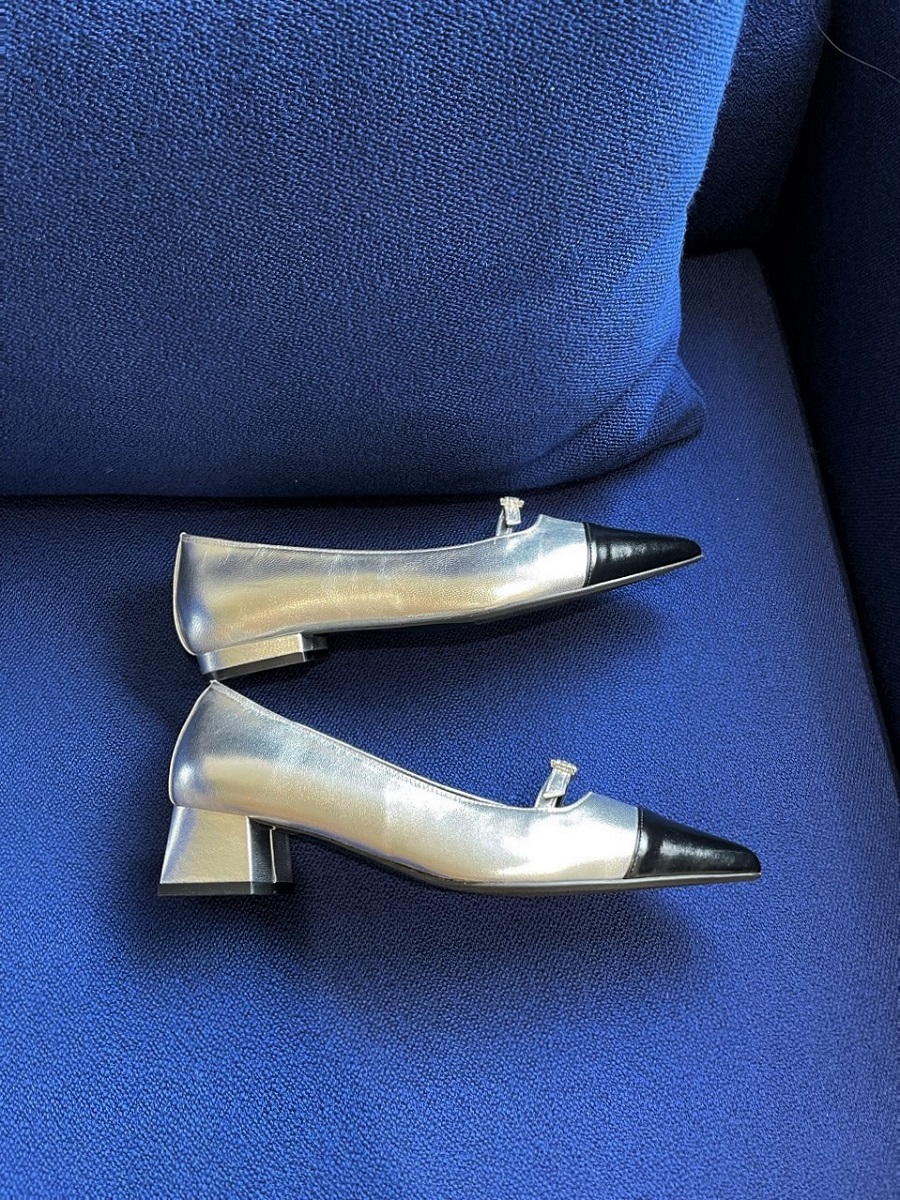 - 발등의 작은 보석 장식이 과하지 않은 은은한 포인트를 주며, 실버컬러 소재와 함께 어우러져 드레시한 느낌을 주는 슈즈 입니다.