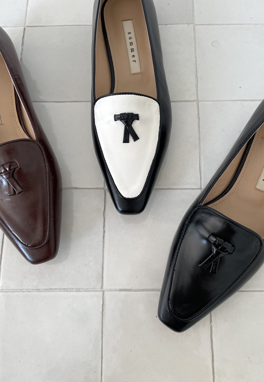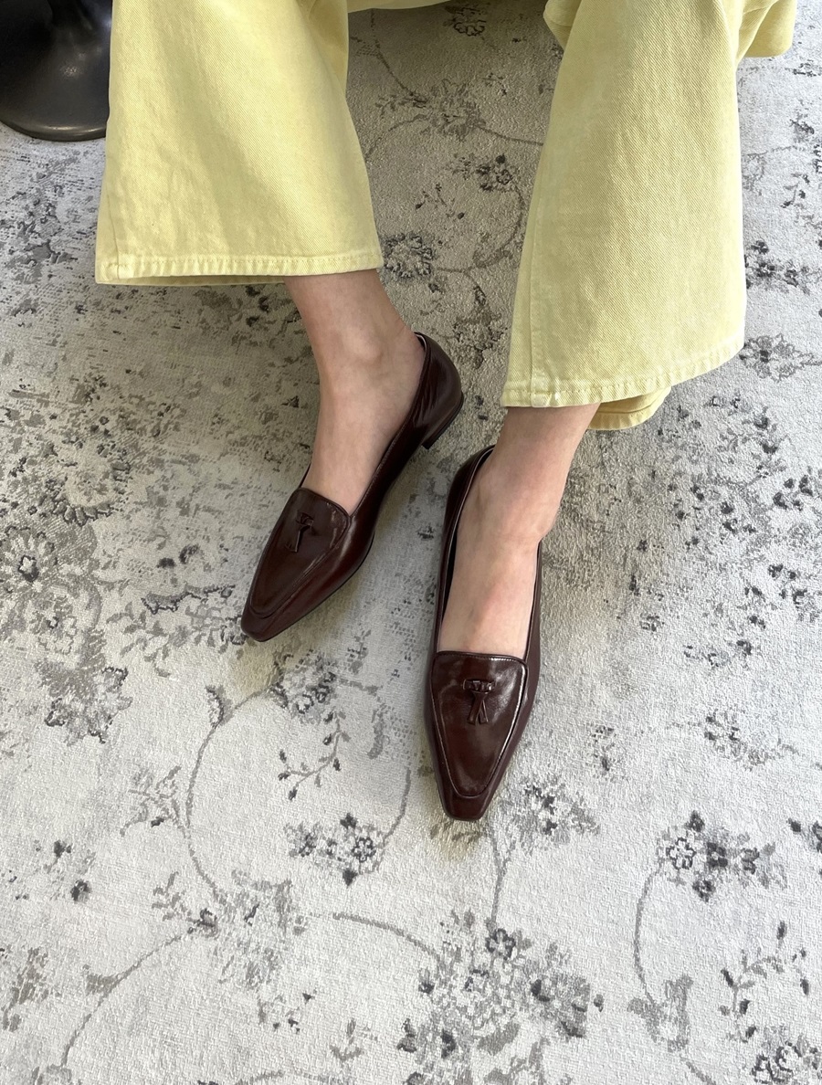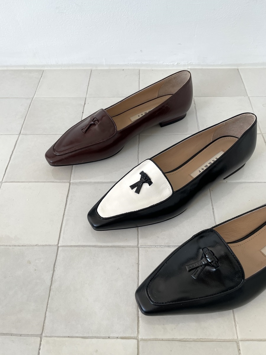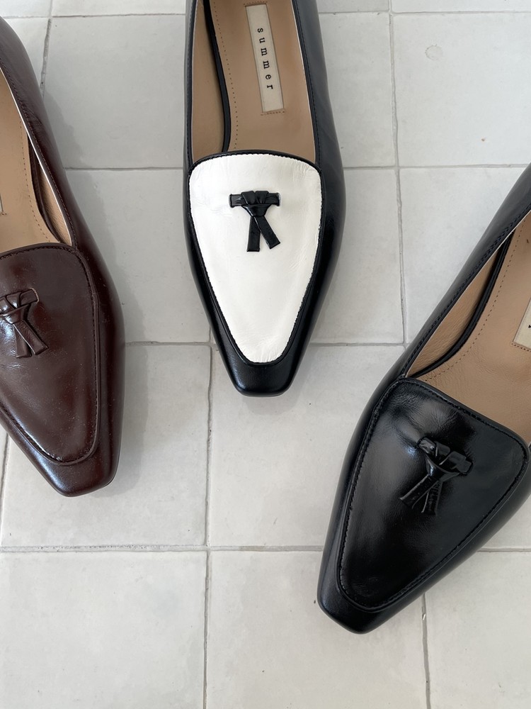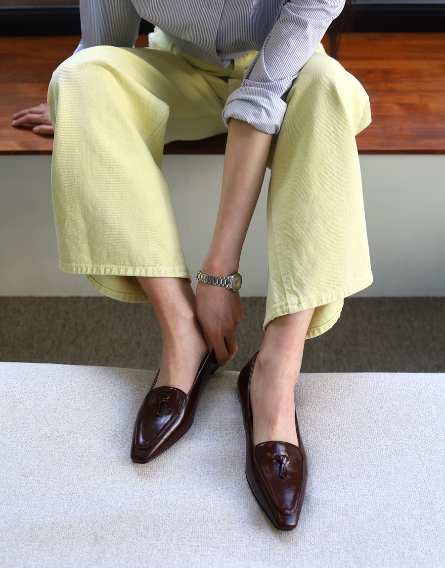 -슬림하게 빠진 스퀘어 토의 라스트에 자연스러운 광택감의 부드러운 소가죽, 작고 단정한 탓셀 장식을 넣어 군더더기 없이 깔끔하게 디자인한 1cm 로퍼 입니다.