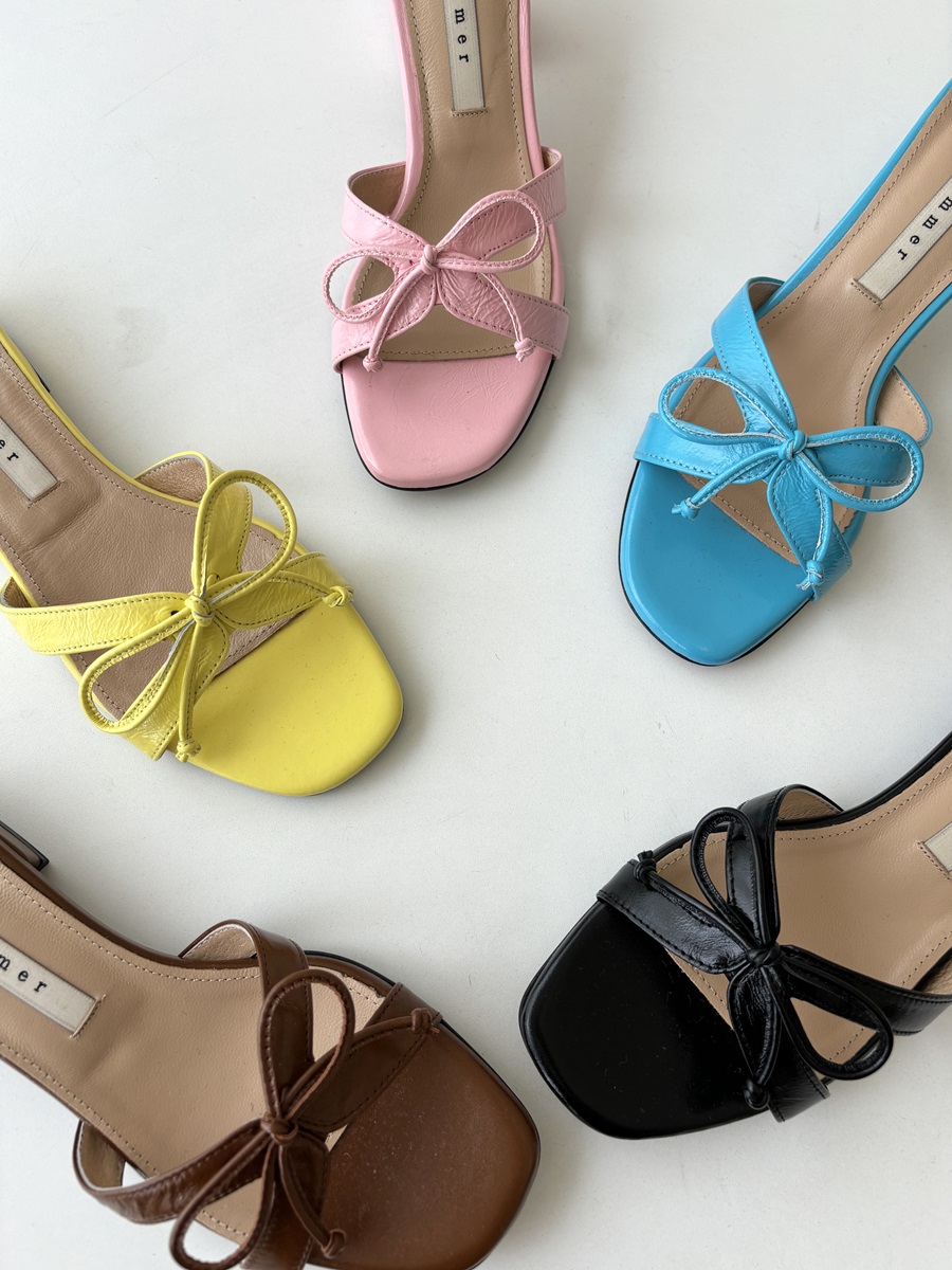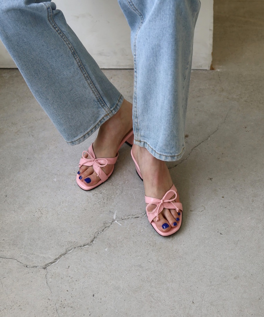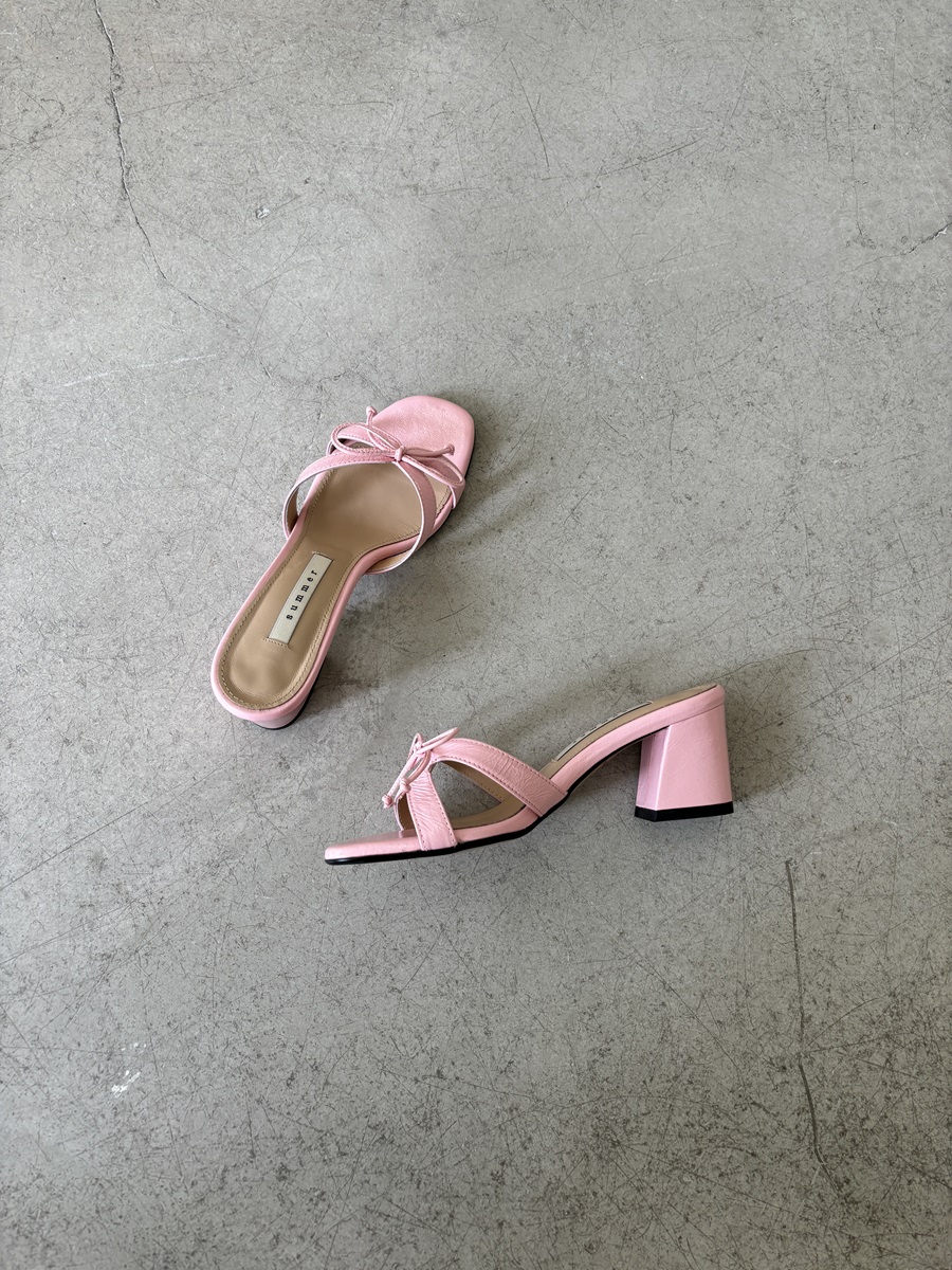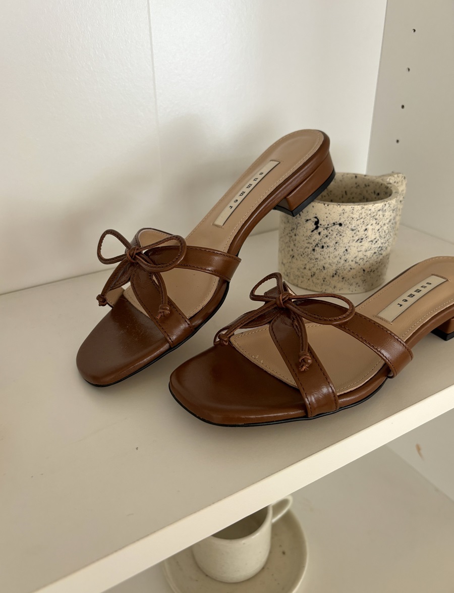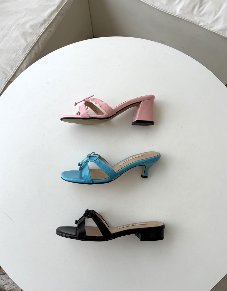 - 양쪽으로 잡아주는 U라인 패턴에 제 가죽 리본을 러프하게 묶어 포인트를 준 2cm 뮬 샌들입니다.