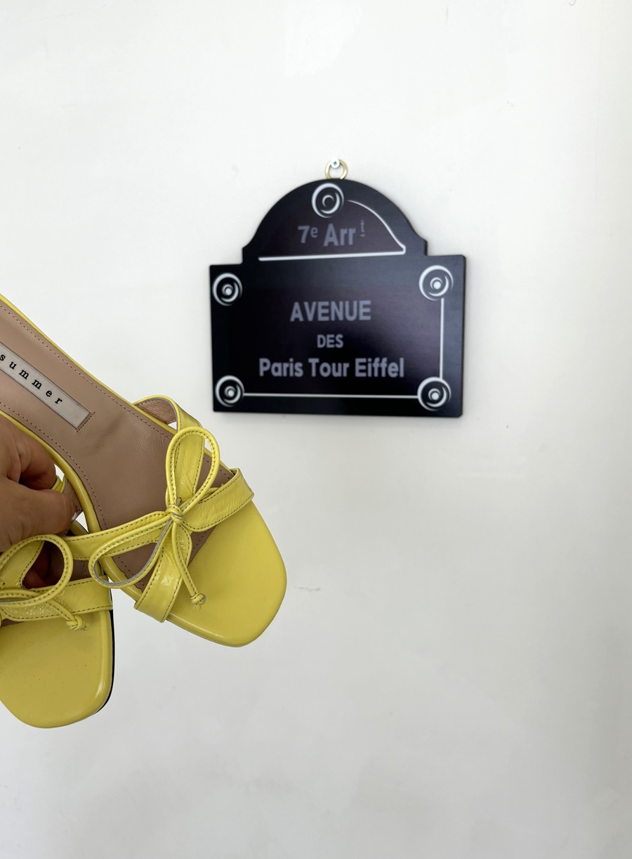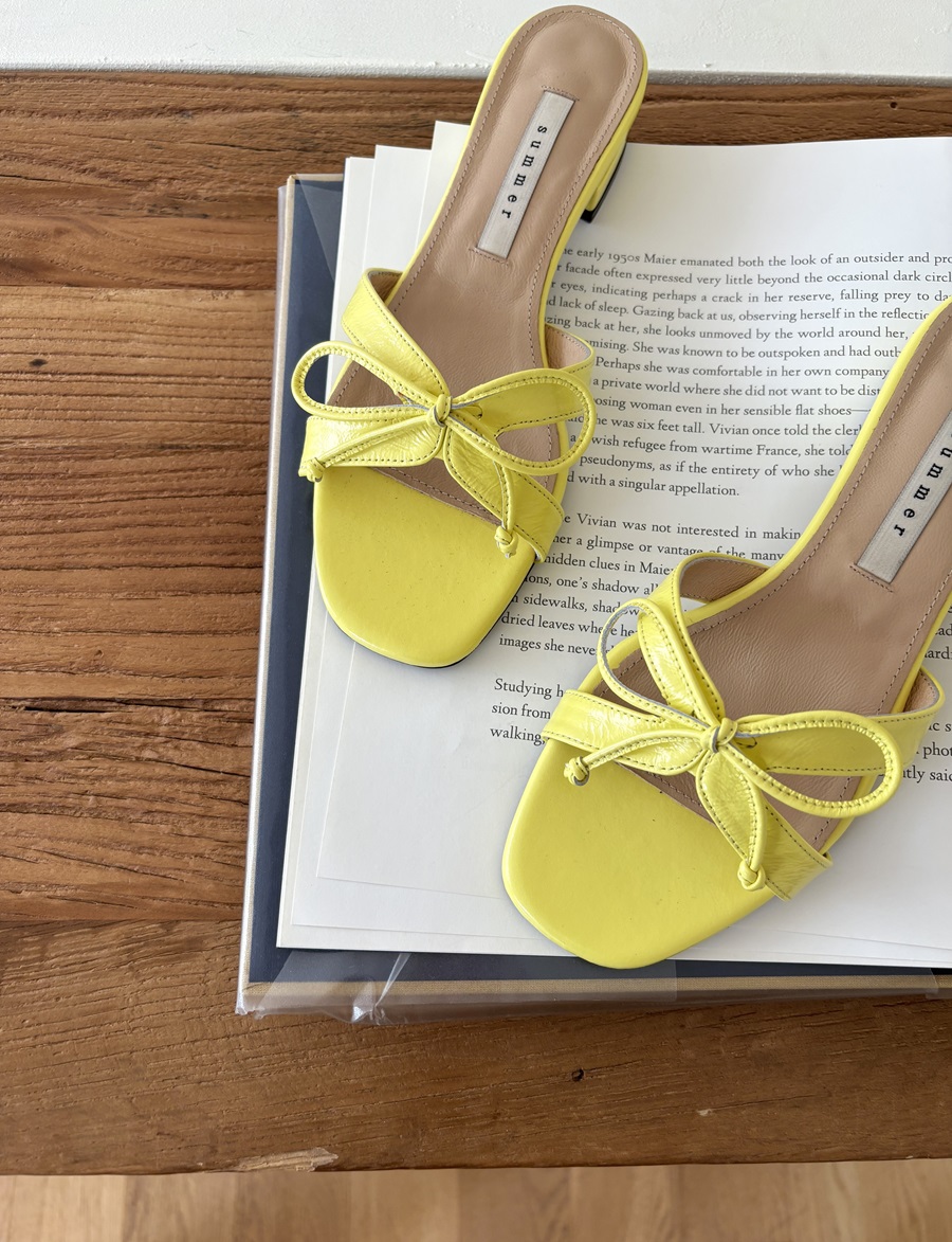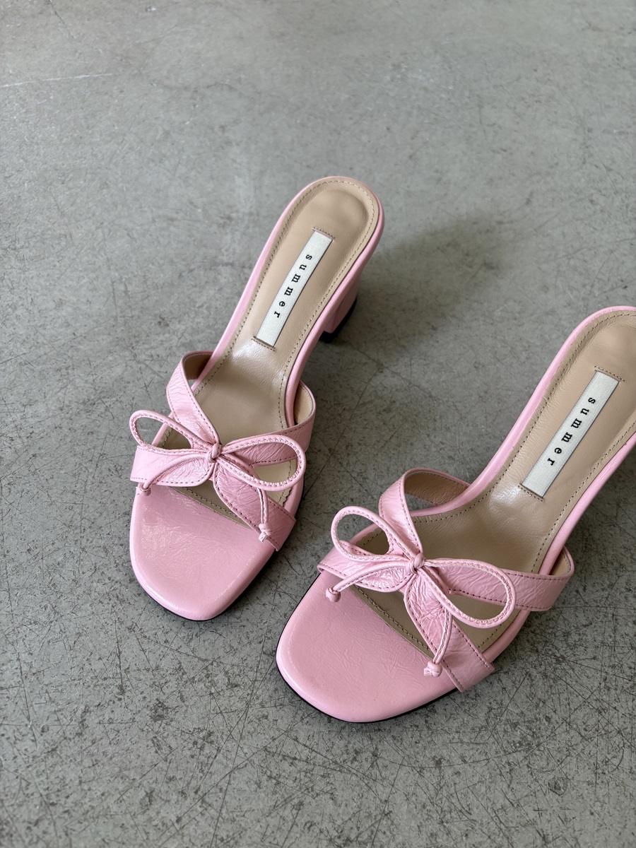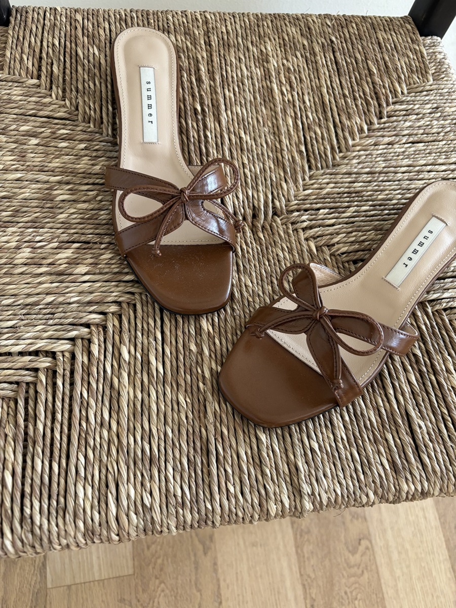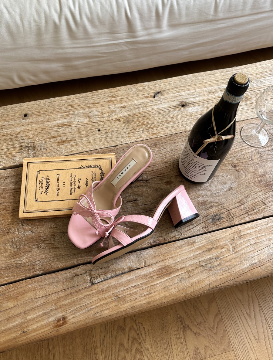 - 양쪽으로 잡아주는 U라인 패턴에 제 가죽 리본을 러프하게 묶어 포인트를 준 2cm 뮬 샌들입니다.