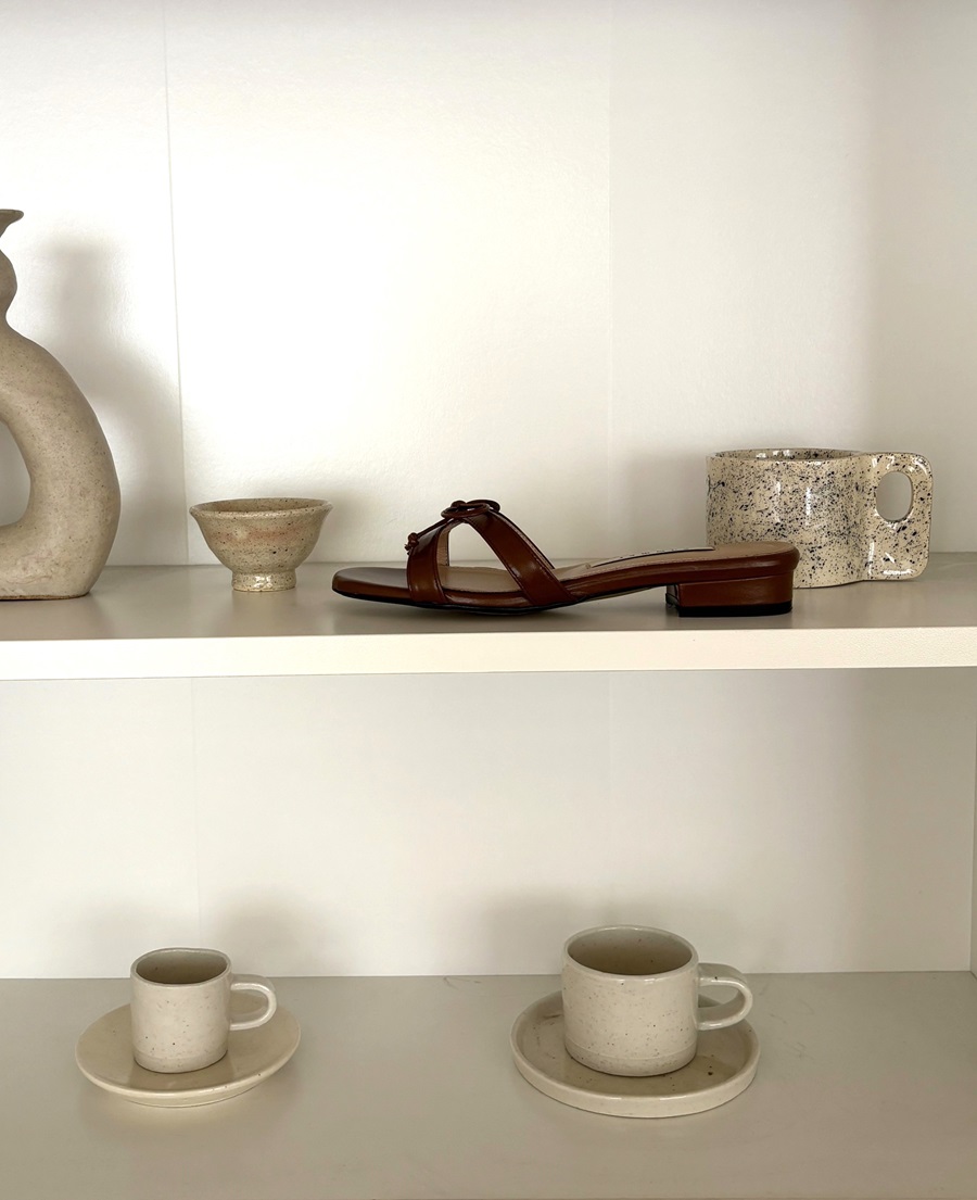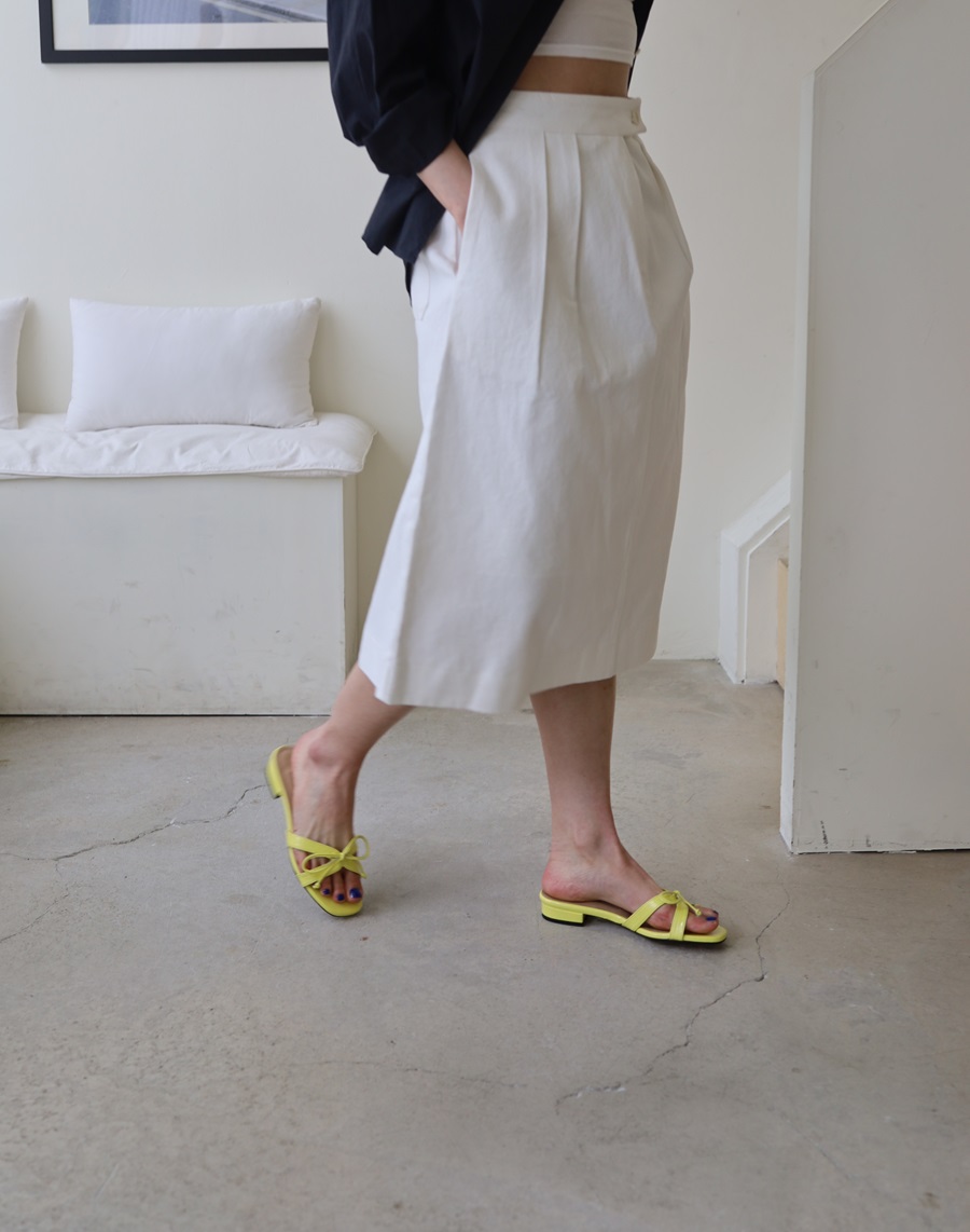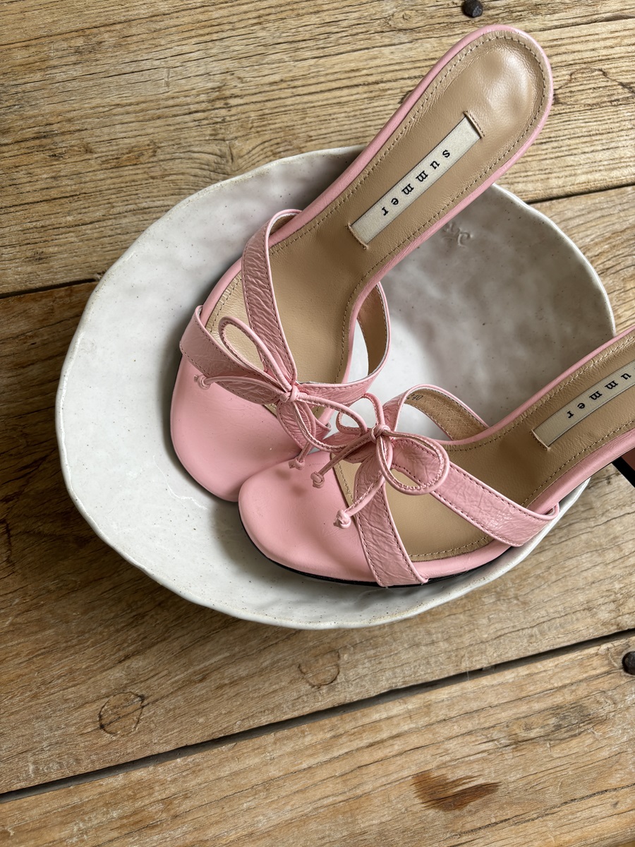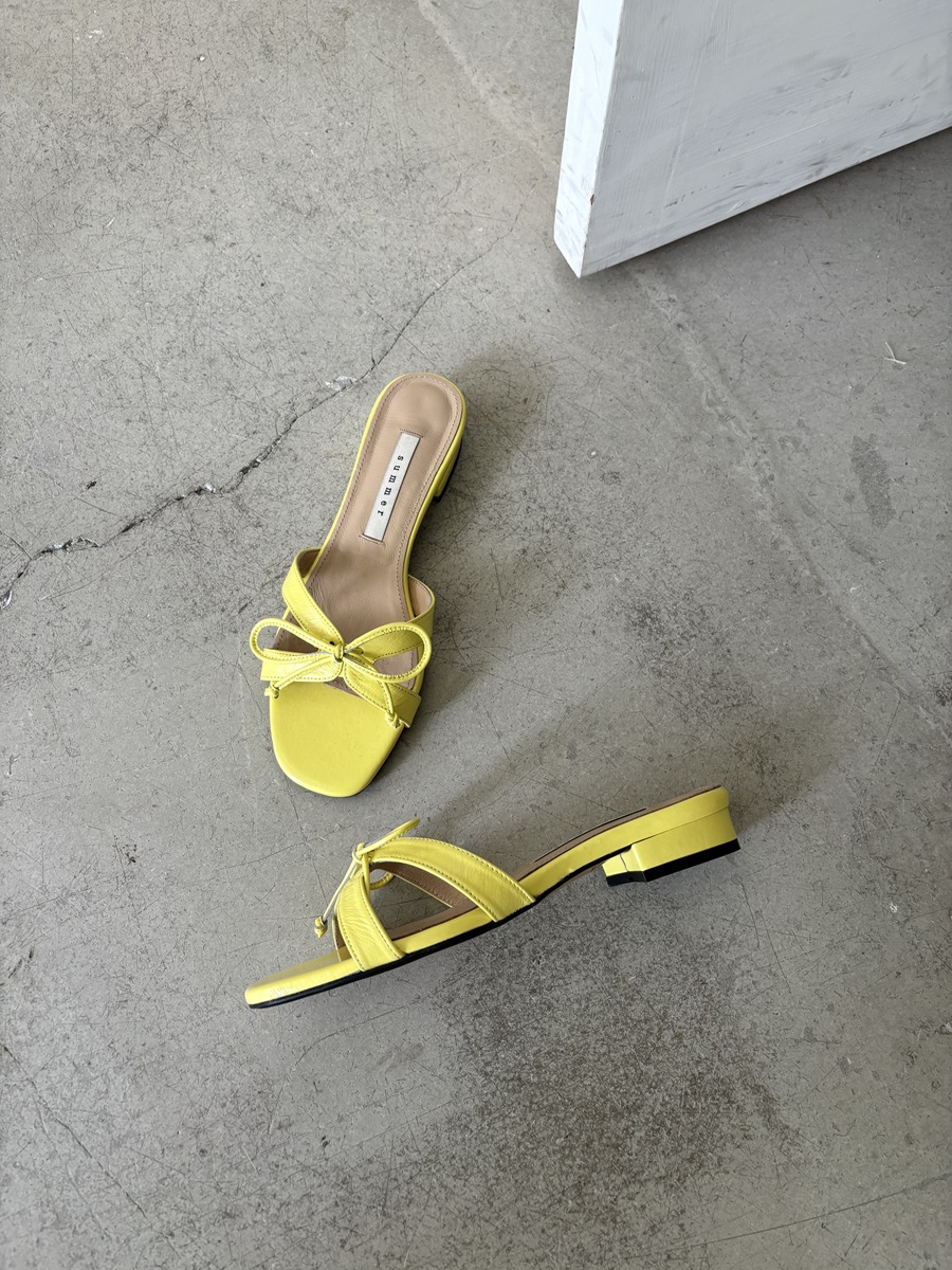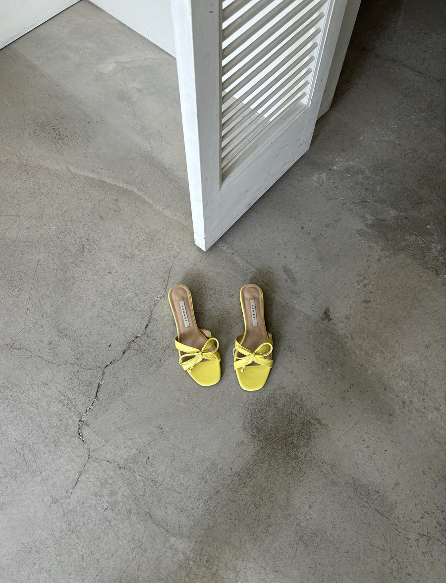 - 양쪽으로 잡아주는 U라인 패턴에 제 가죽 리본을 러프하게 묶어 포인트를 준 2cm 뮬 샌들입니다.