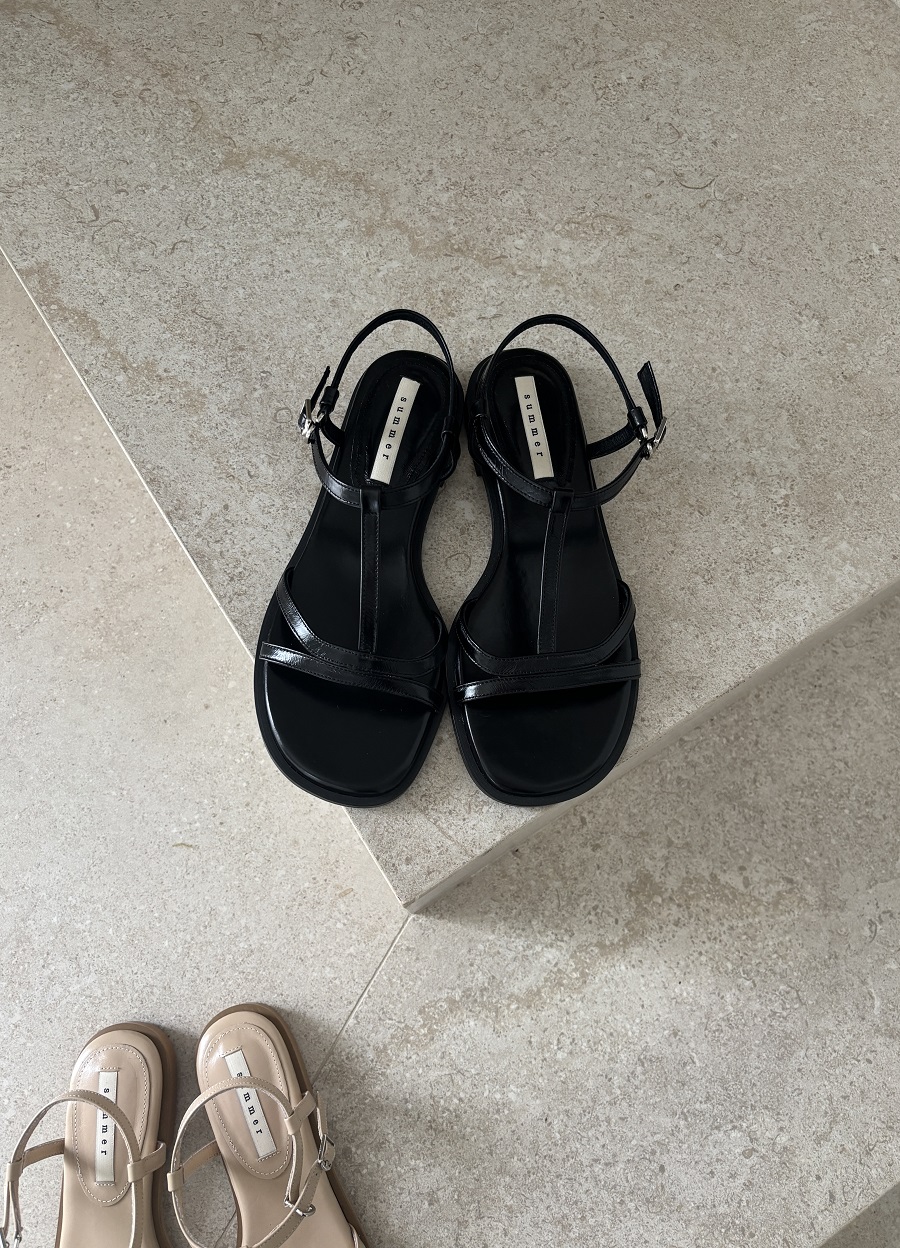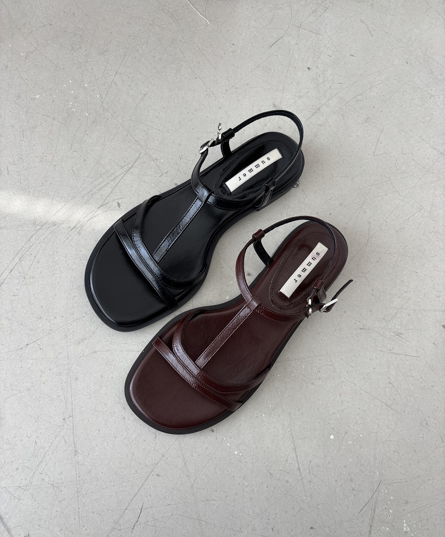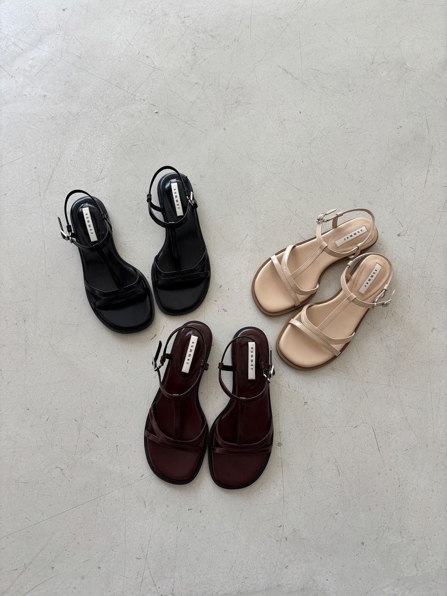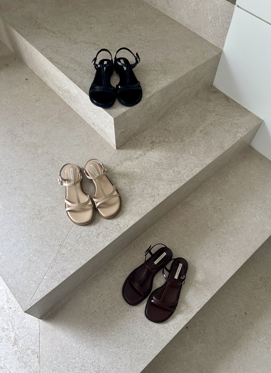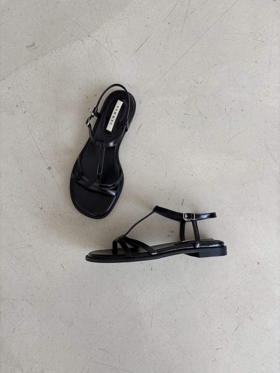 - 일정한 간격의 스트랩들로 모던한 라인 포인트를 준 T-strap 의 플랫 샌들 디자인 입니다.