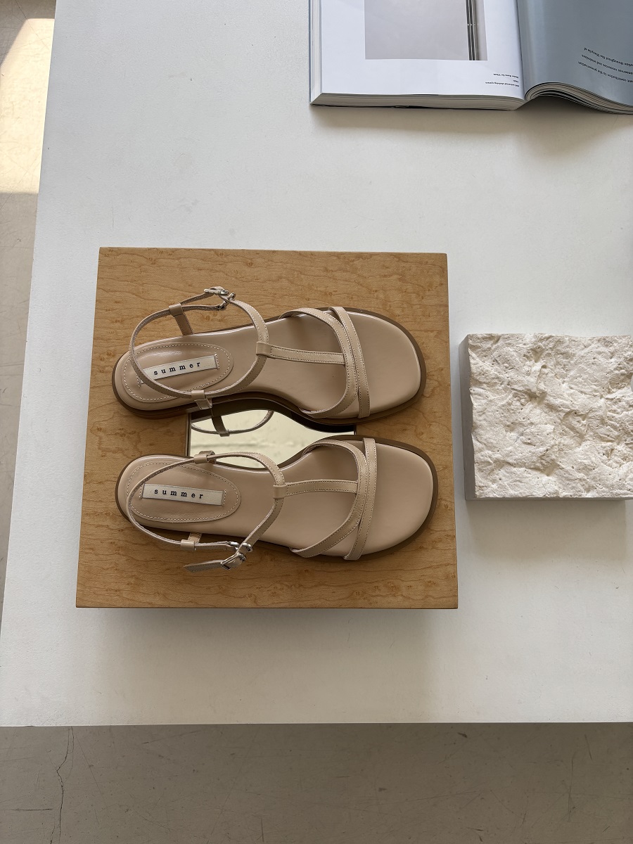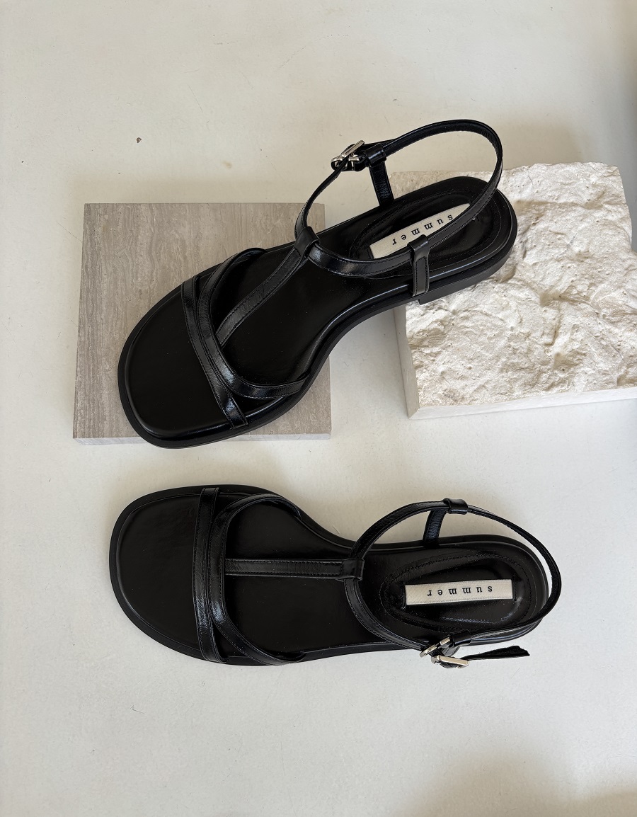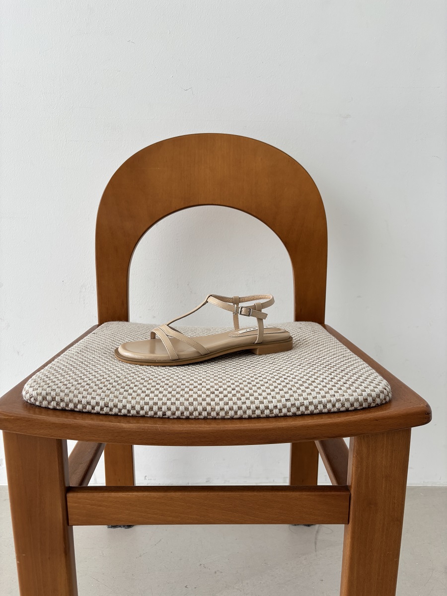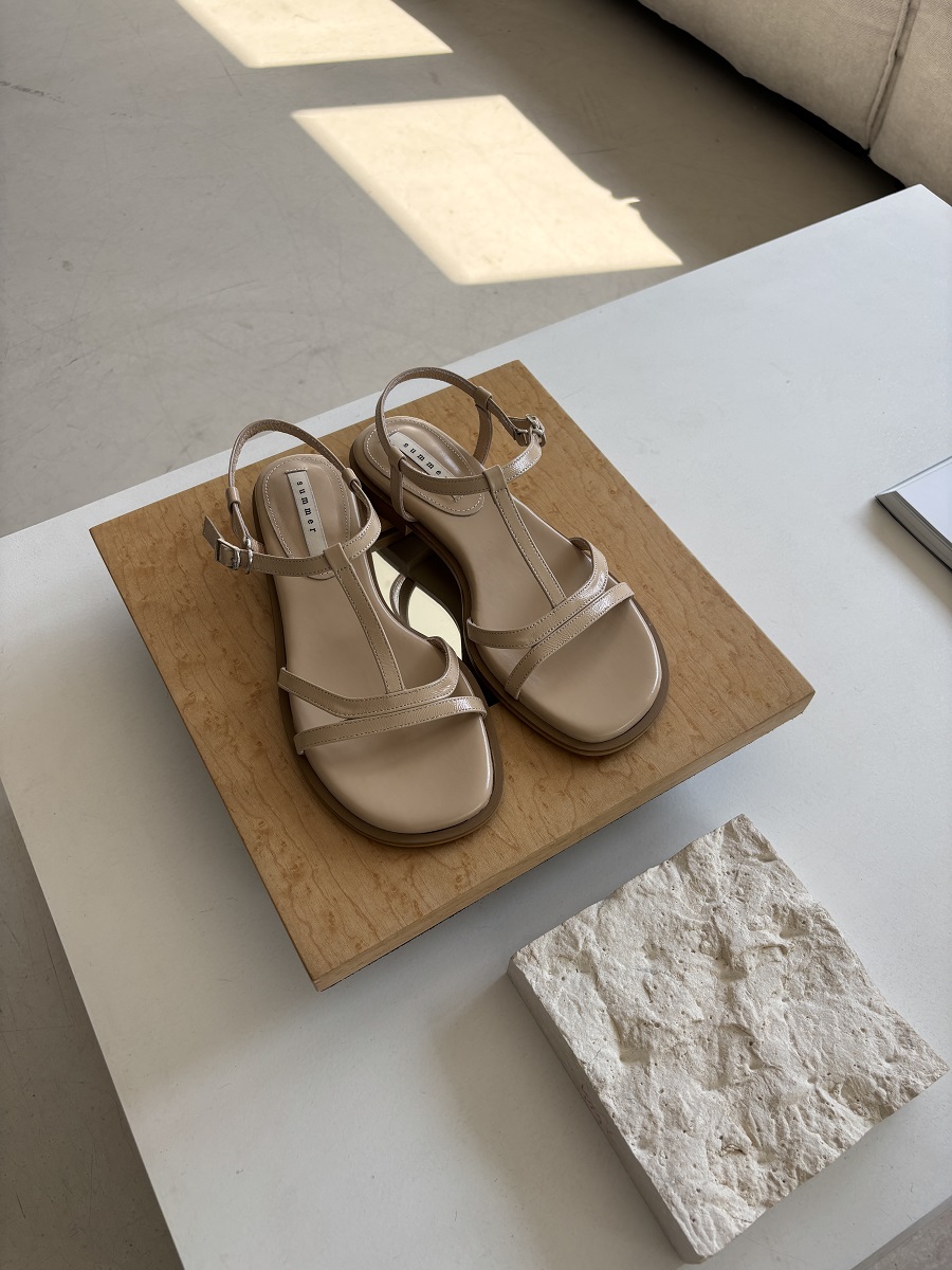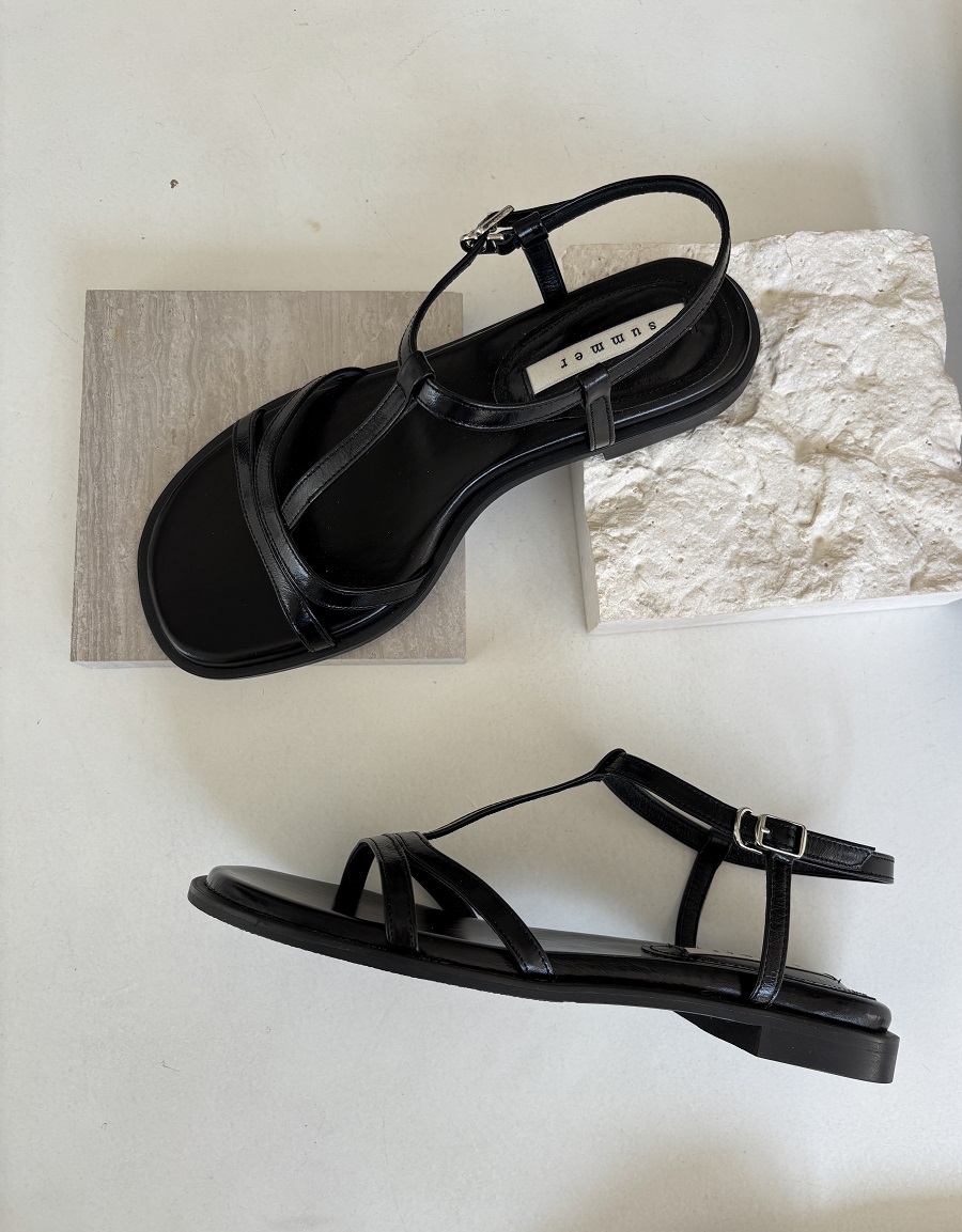 - 일정한 간격의 스트랩들로 모던한 라인 포인트를 준 T-strap 의 플랫 샌들 디자인 입니다.