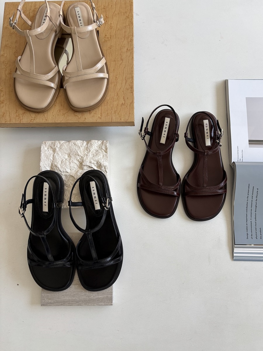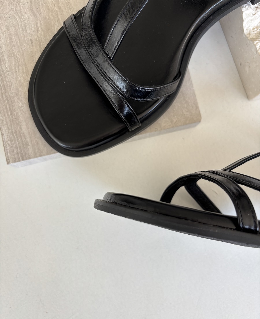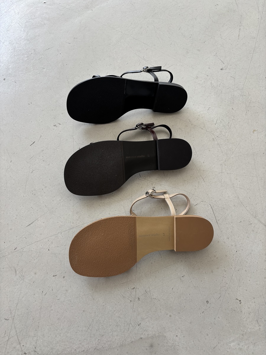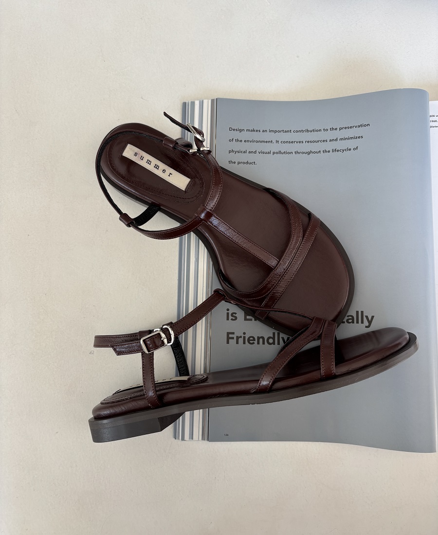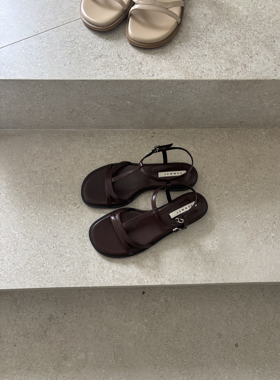 - 일정한 간격의 스트랩들로 모던한 라인 포인트를 준 T-strap 의 플랫 샌들 디자인 입니다.