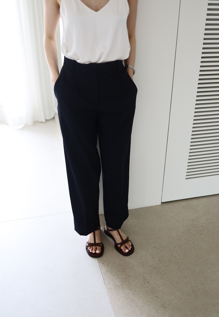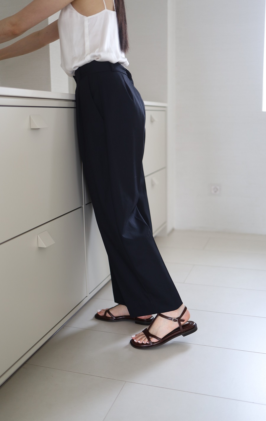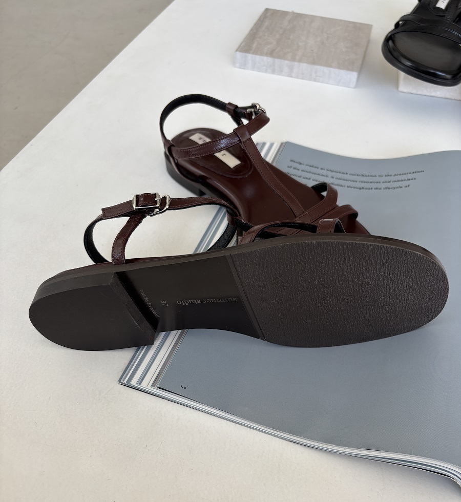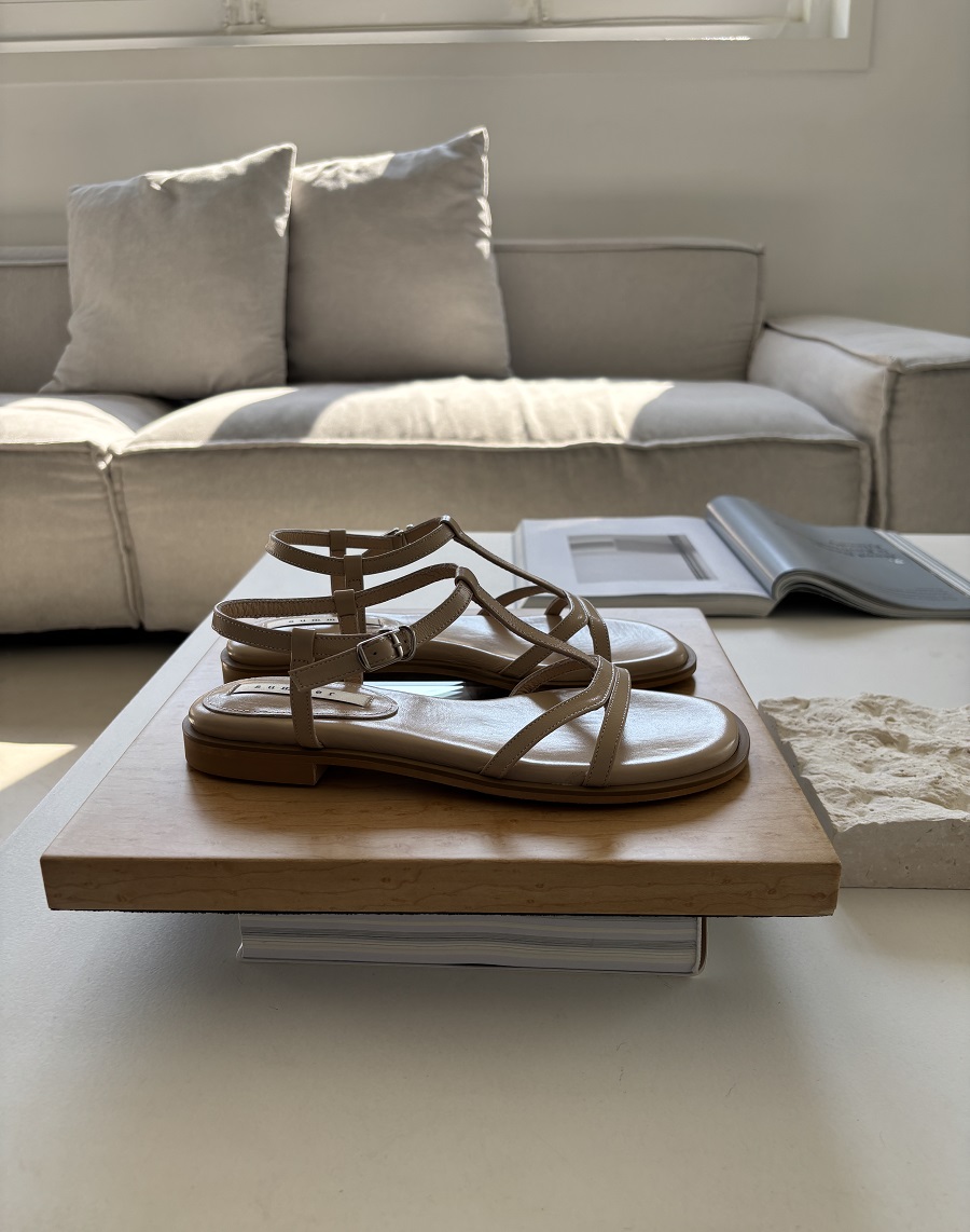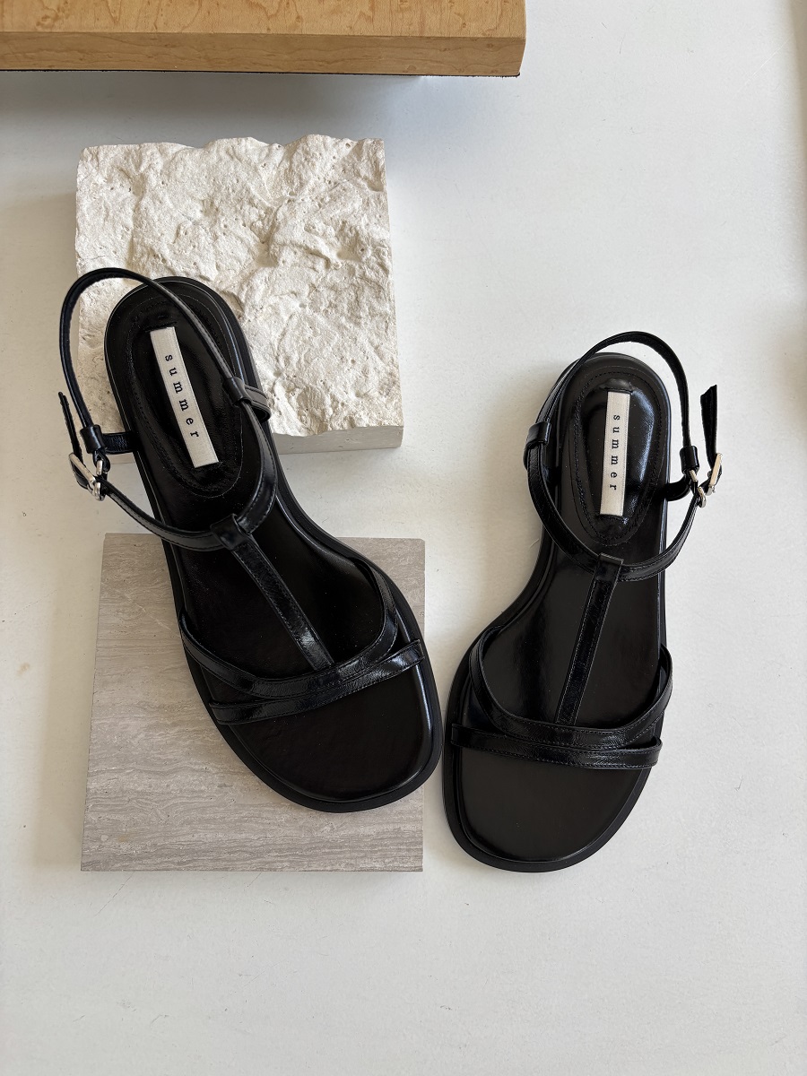 - 일정한 간격의 스트랩들로 모던한 라인 포인트를 준 T-strap 의 플랫 샌들 디자인 입니다.