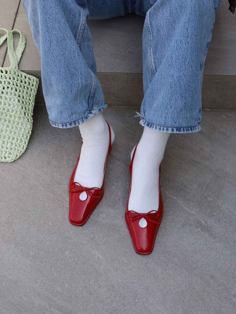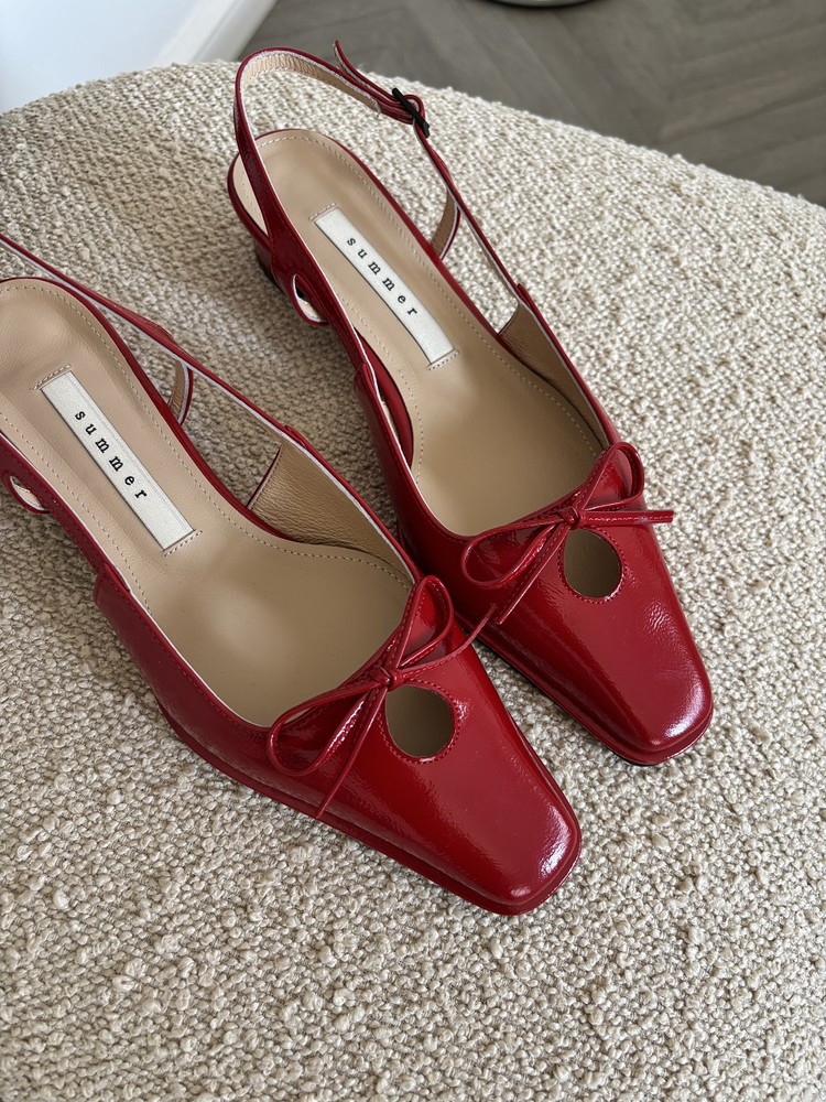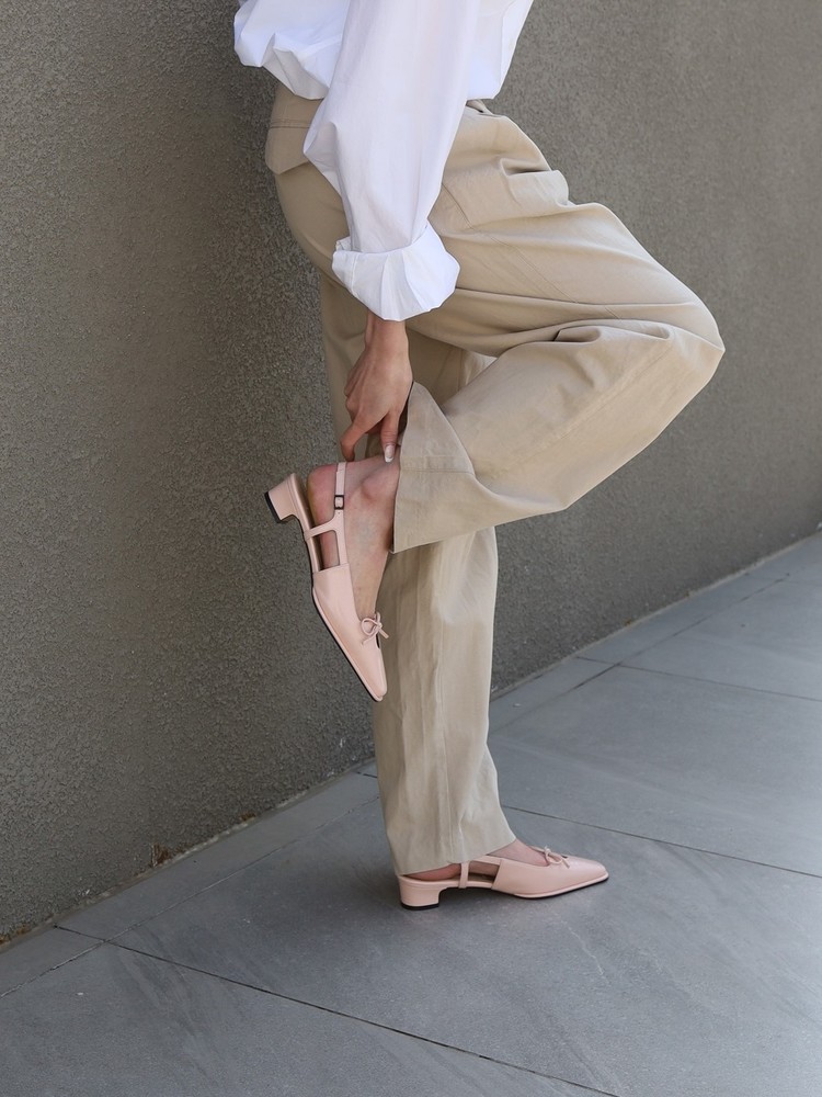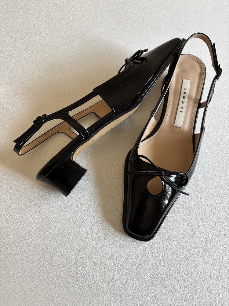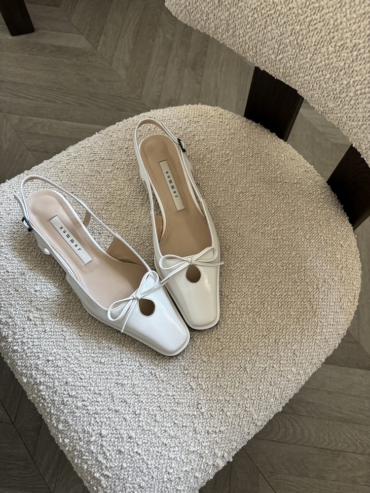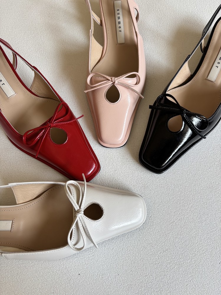 - 날렵한 스퀘어토의 라스트에 물방울 모양의 타원형 컷아웃 디테일과 제 가죽 리본으로 러블리한 포인트를 준 3cm 슬링백 슈즈 입니다.