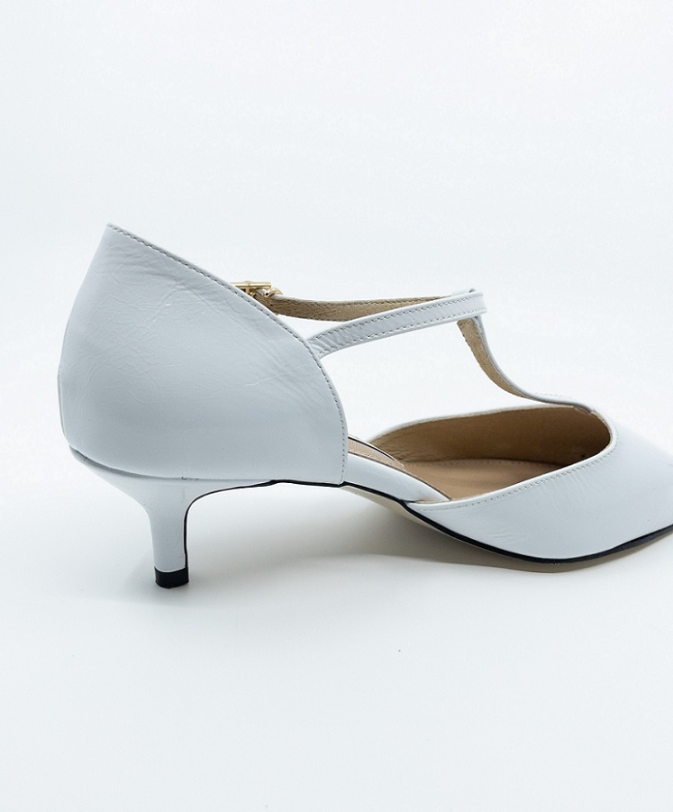 -T-strap 의 기장을 일반적인 기준보다 짧게 위치하도록 디자인하여 발목의 가장 가는 부분 아래쪽에 시선이 집중되므로 발목이 더욱 가늘어 보이고 종아리가 더 길어보이는 효과가 있습니다.