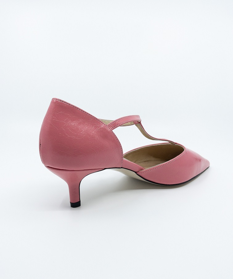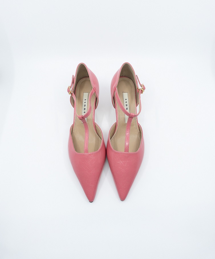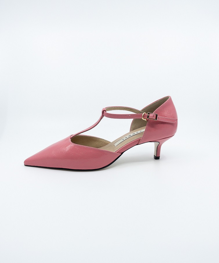 -T-strap 의 기장을 일반적인 기준보다 짧게 위치하도록 디자인하여 발목의 가장 가는 부분 아래쪽에 시선이 집중되므로 발목이 더욱 가늘어 보이고 종아리가 더 길어보이는 효과가 있습니다.